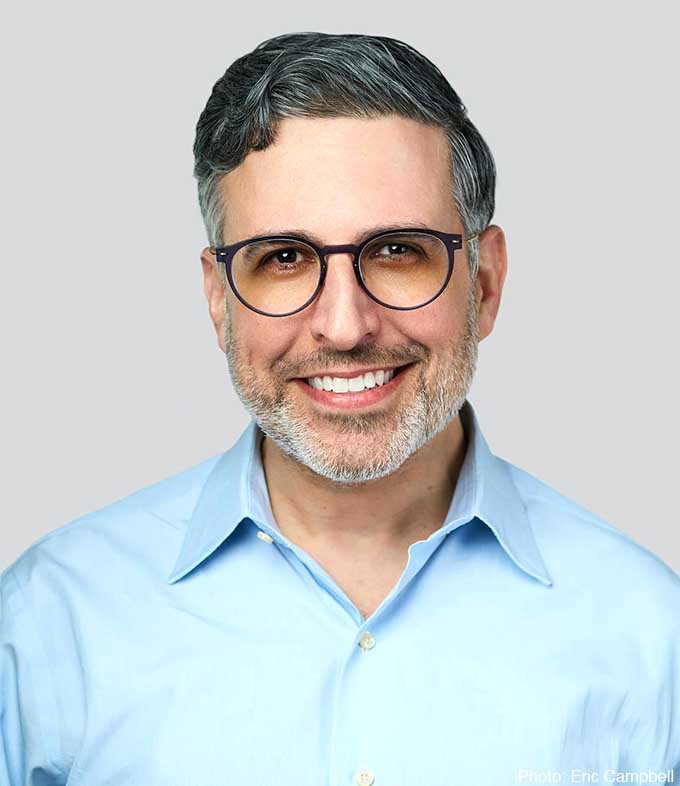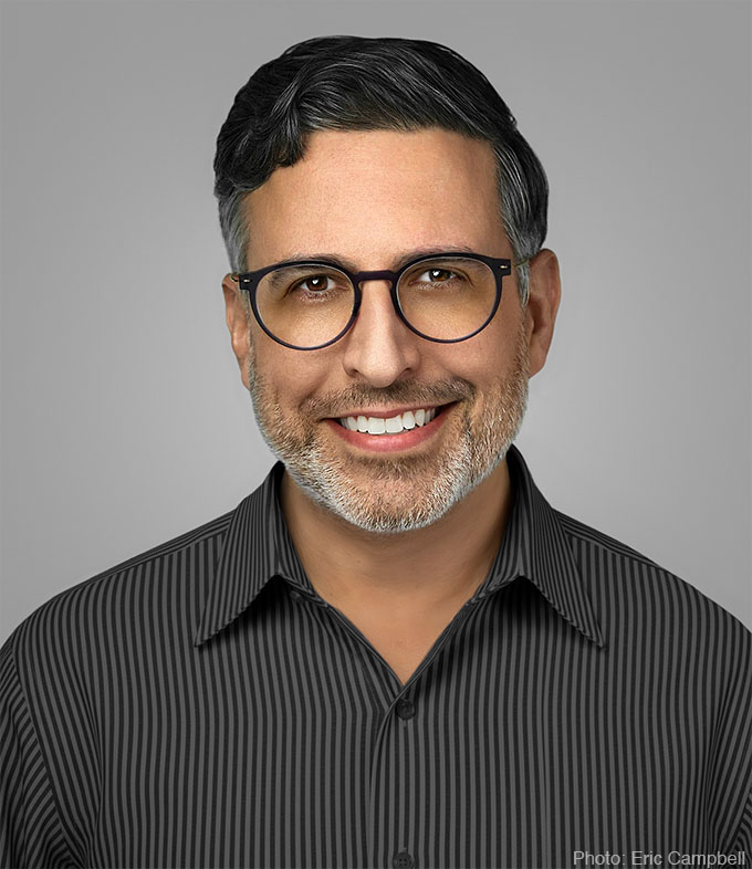 Bright clothing is always distracting, so the shirt was replaced with a darker version. Eyes are vital in a portrait, so eyeglass shadows were removed and the eyes brightened. The lighting on the face and neck was evened out to make the skin look healthier.