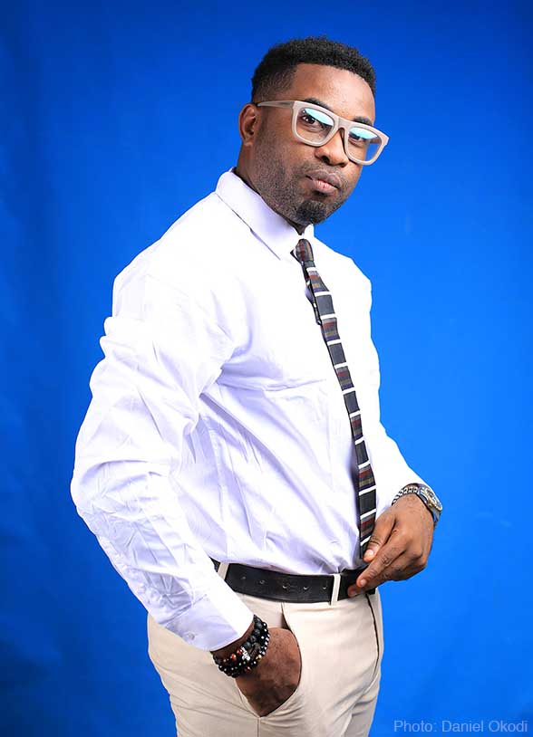 The original portrait (above) is a mess. The white shirt is very overexposed, wrinkled, and distracting. Big reflections in the eyeglasses obscure the subject’s eyes, and one eye has an odd, extra catchlight. The background is too bright, poorly lit, and wrinkled. On top of all that, the pose looks awkward.