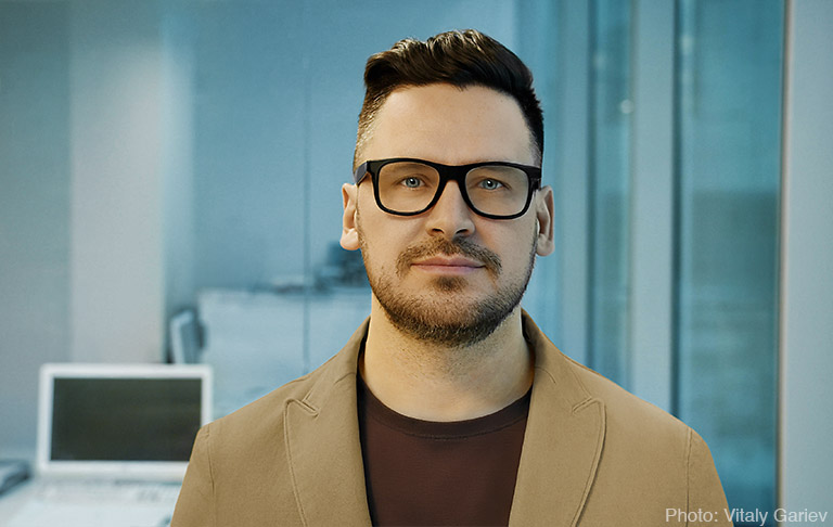 The original photo isn’t usable for a business portrait. The dark eyes, the reflections in the eyeglasses, the odd skin colour, the sour facial expression, and all the distractions in the background make this photo very weak.